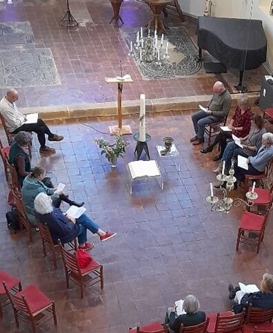 Per mail ontvangt je ’n week van tevoren studiemateriaal. Anderhalf uur voorafgaand aan de viering komen we samen voor ’n repetitie.